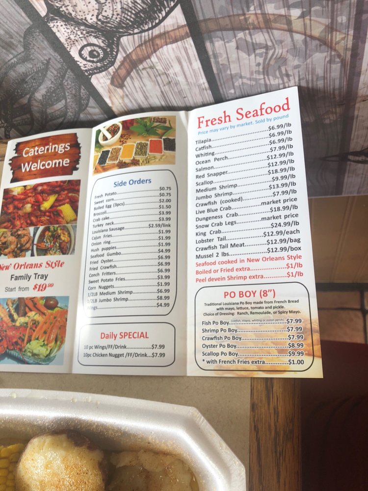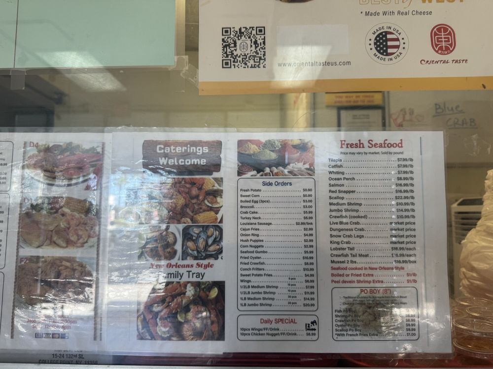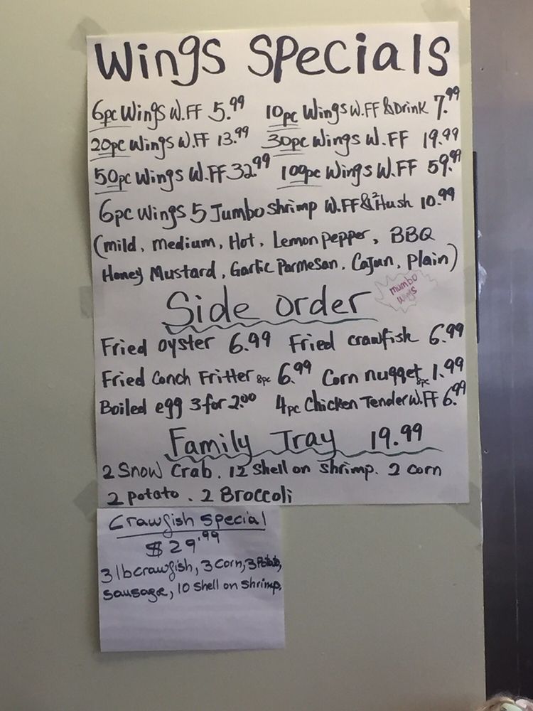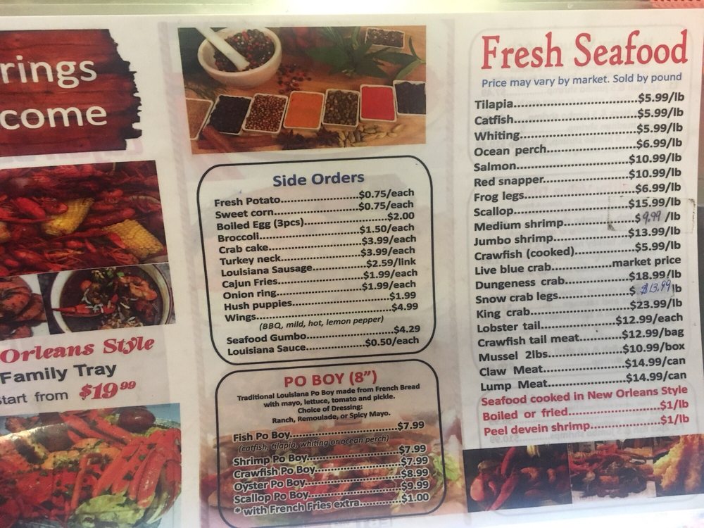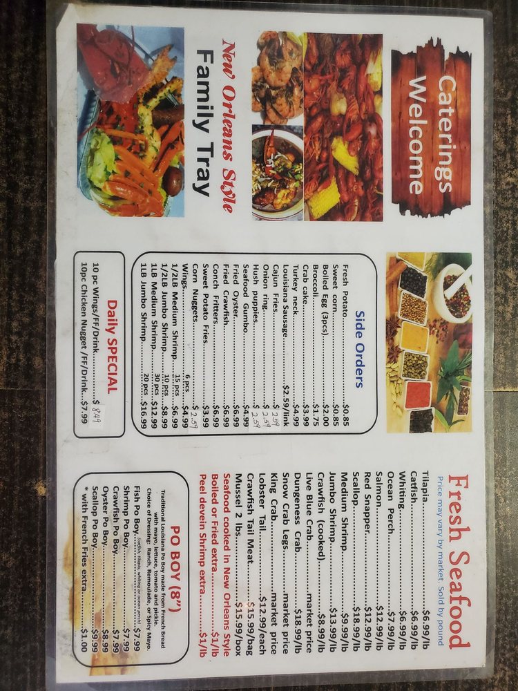 “ This is my second time visiting this restaurant. The lady at the register was very friendly and spoke good English. She was very helpful. I watched her interact with other customers and she provided great customer service. I choose the 10 wing special $8.99 which includes 10 Wings, fries, and a drink. I did half lemon pepper which is the most popular. Three other half was hot garlic. I also ordered the Cajun & butter 1 Snow crab leg, 5 Shrimp, corn, potato, and broccoli combo$15.99. All the food was good. The wings were fried extra crispy however they use garlic seasoning and not real garlic! The Cajun crab leg combo had good flavor but I don't like that the pour the water from the steam into the box. It waters down the flavor and seasoning. Also the Shrimp had an aftertaste. I can't pinpoint it but i didn't like that! The seafood looks fresh and is on display when you walk in. They have a wall that has a wide variety of Louisiana seasonings for purchase. They also have a tray full of different sauces and small containers if you want extra seasoning to go. ”
