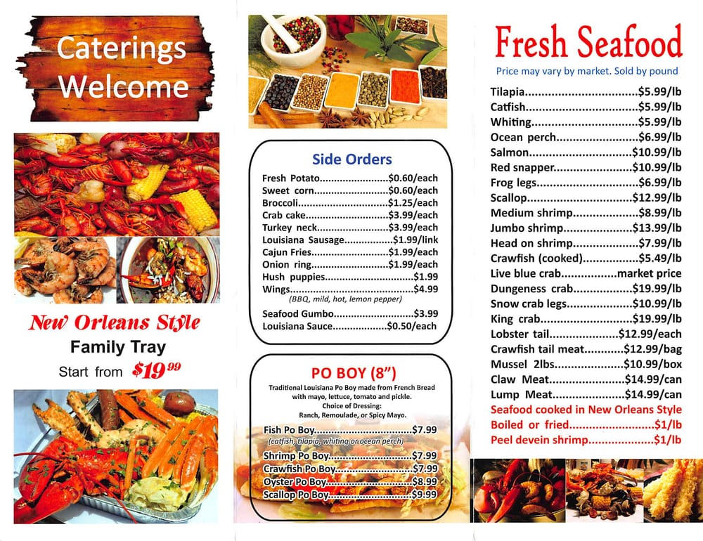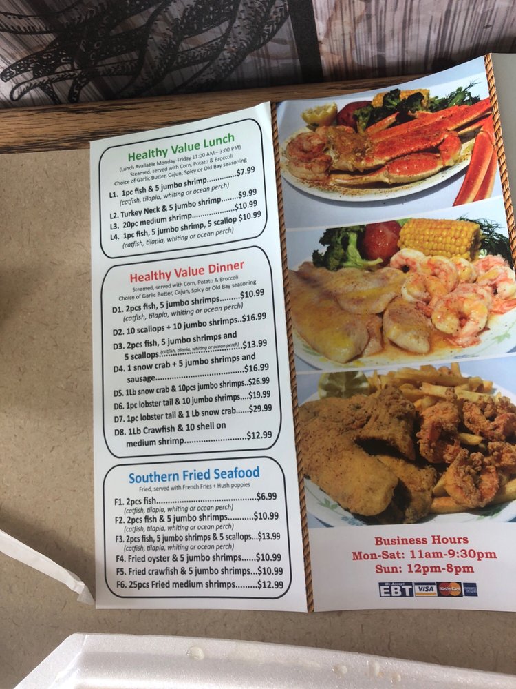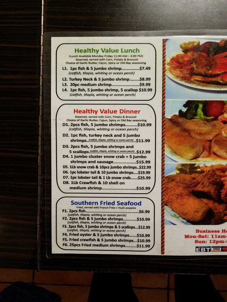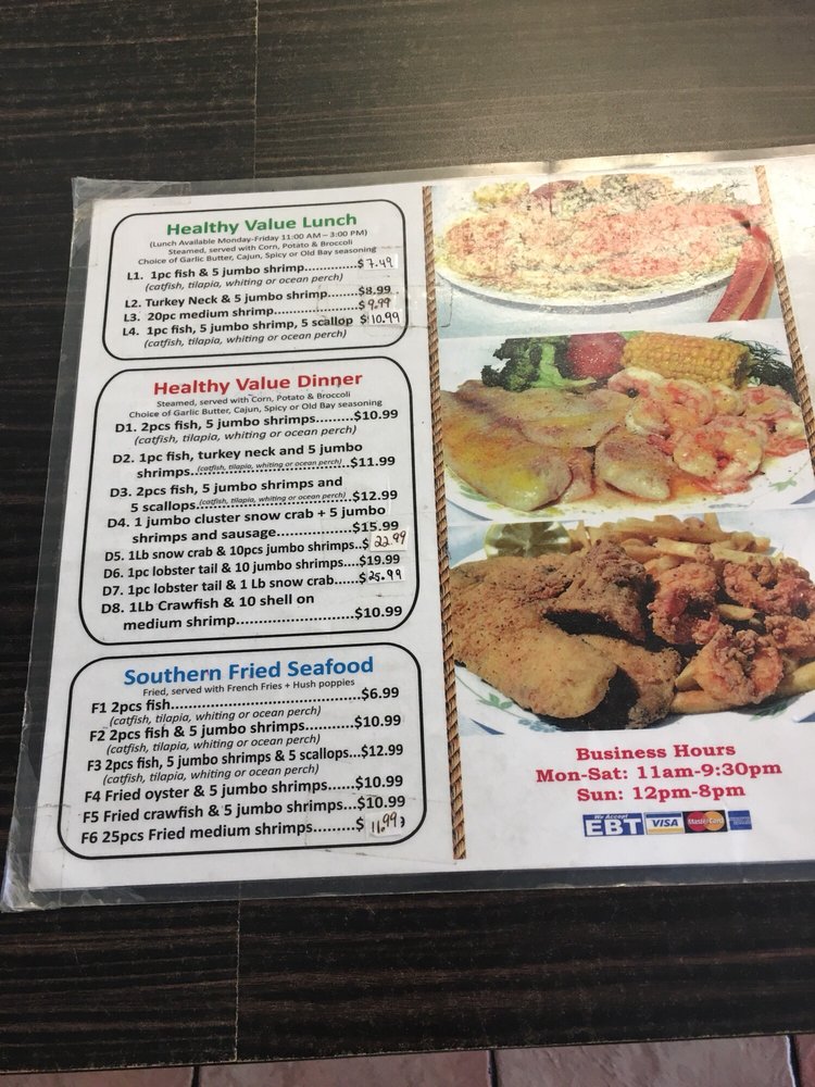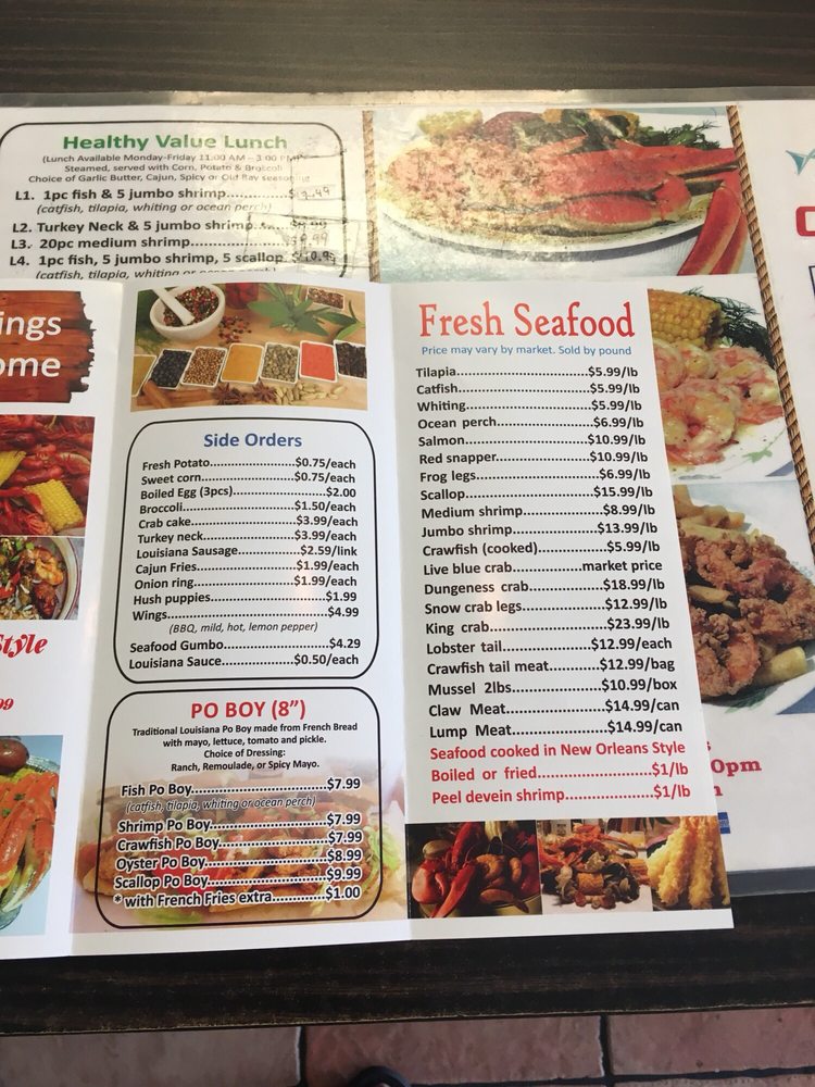 “ This is my second time visiting this restaurant. The lady at the register was very friendly and spoke good English. She was very helpful. I watched her interact with other customers and she provided great customer service. I choose the 10 wing special $8.99 which includes 10 Wings, fries, and a drink. I did half lemon pepper which is the most popular. Three other half was hot garlic. I also ordered the Cajun & butter 1 Snow crab leg, 5 Shrimp, corn, potato, and broccoli combo$15.99. All the food was good. The wings were fried extra crispy however they use garlic seasoning and not real garlic! The Cajun crab leg combo had good flavor but I don't like that the pour the water from the steam into the box. It waters down the flavor and seasoning. Also the Shrimp had an aftertaste. I can't pinpoint it but i didn't like that! The seafood looks fresh and is on display when you walk in. They have a wall that has a wide variety of Louisiana seasonings for purchase. They also have a tray full of different sauces and small containers if you want extra seasoning to go. ”